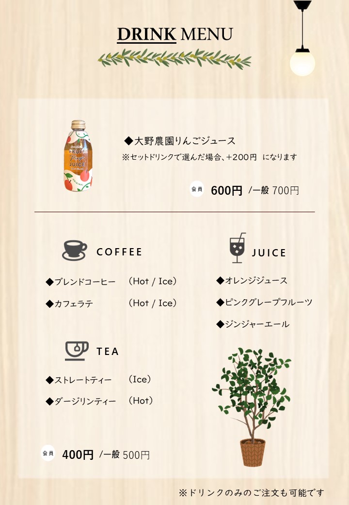 ドリンクメニュー※ドリンクのみのご注文も可能です
